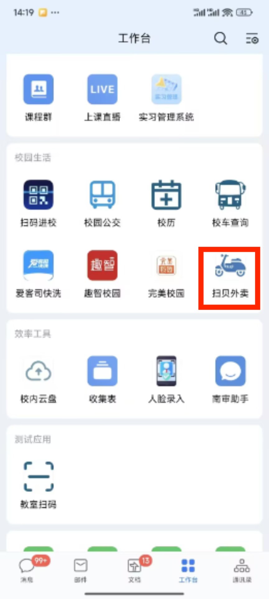 ②"企业微信""工作台"—"扫贝外卖"一进入系统一选择定位一点餐