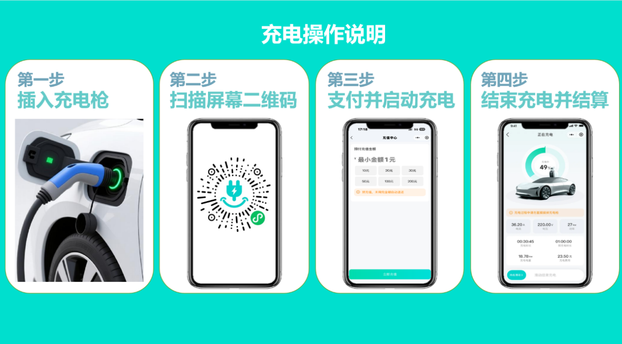 新能源汽车充电桩:插入充电枪→扫码→支付并启动充电→停止