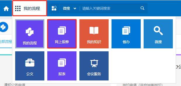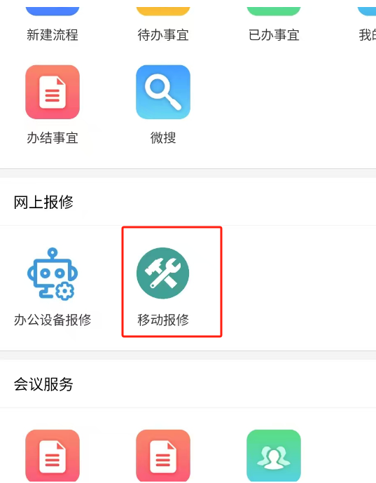 方式二:手机端,学校官方微信企业号—工作台—流程服务—移动报修。